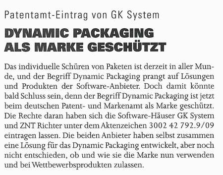 FVW Online / NEWS 15.012003. 13:37, Flüge und Mietwagen im Web kombinieren Die IT-Firmen GK System und ZNT-Richter haben eine Demoversion ihrer neu entwickelten technischen Lösung für das Dynamic Packaging ins Internet gestellt. Mit dieser Technologie lassen sich für Online-Buchungen aus verschiedenen Leistungen Gesamtpakete für den Kunden schnüren. Interessierte Veranstalter und Reiseanbieter können mit realen Buchungen diese Zusammenstellung von Flügen und Mietwagen zu einem Angebot testen.